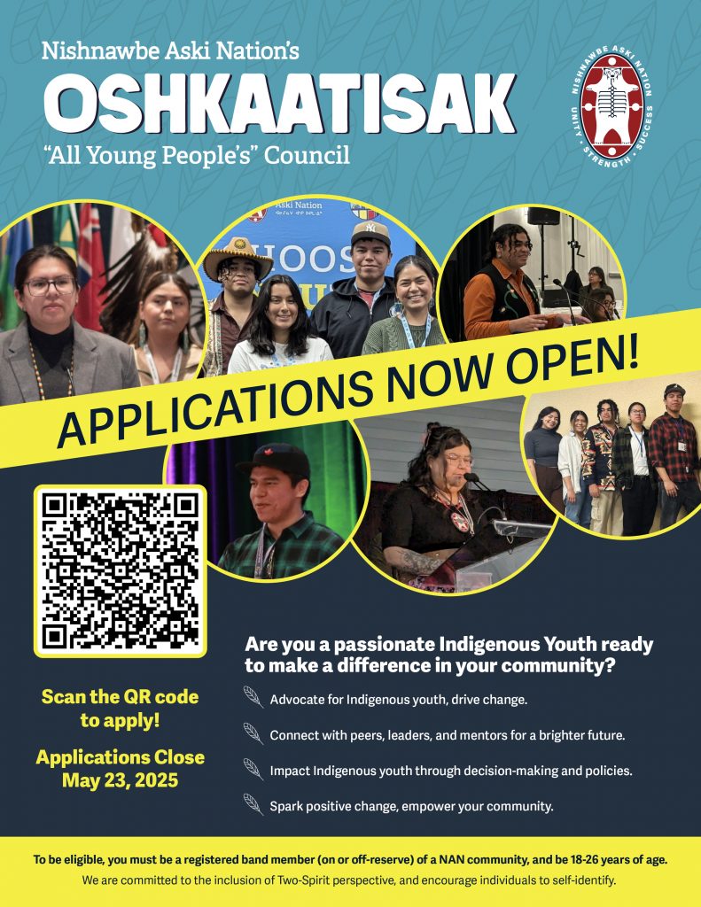 The Oshkaatisak (All Young Peoples) Council represents the youth of NAN. The Oshkaatisak Council strives to promote youth empowerment and engagement with the goal of improving the livelihood and hope for the future of all NAN youth.