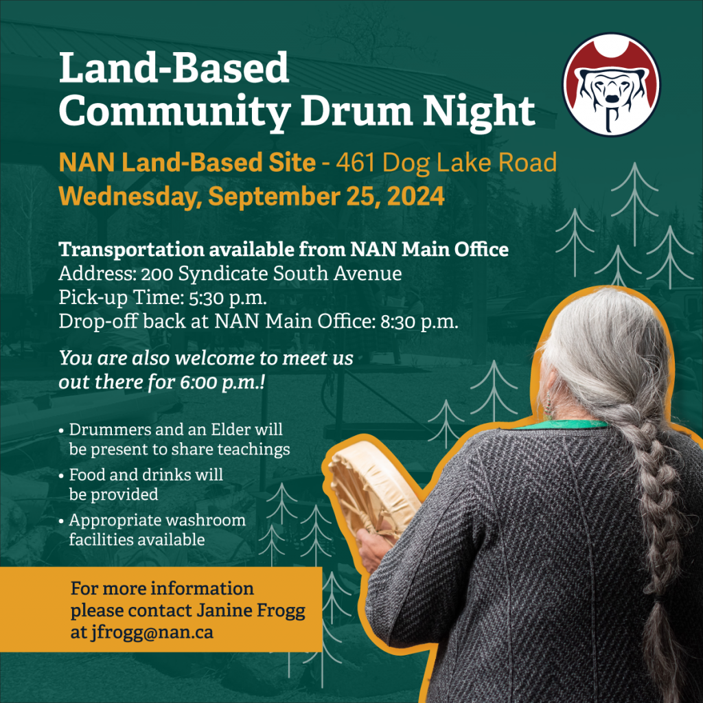 Come together for an evening of drumming, teachings, and community on Wednesday, September 25, 2024, at the NAN Land-Based Site (461 Dog Lake Road).