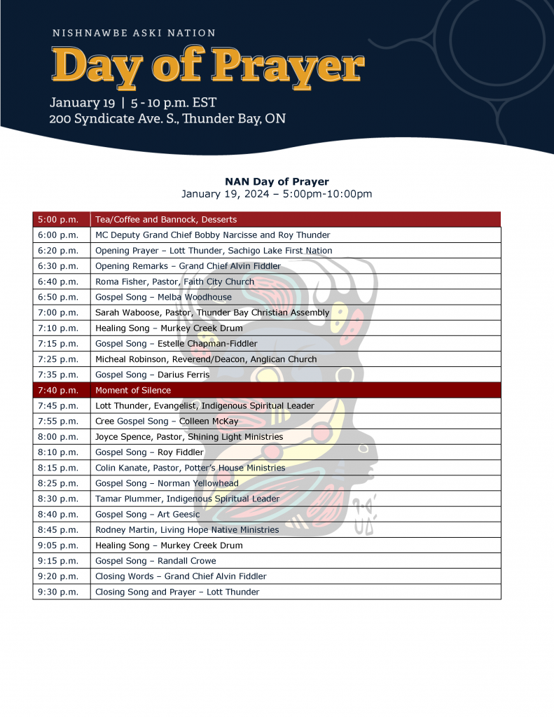 All are welcome to attend the evening session in person at NAN’s Main Office (200 Syndicate Ave S., Thunder Bay) or virtually.