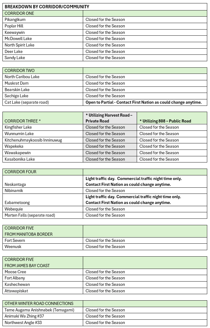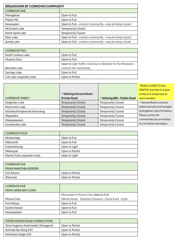 We strongly encourage all travelers to contact the First Nation for the most up to date information on the winter road status prior to traveling, including whether roads are open for travel as temporary closures do take place on the roads, even when at full load capacity. When roads are identified as closed it could be for various reasons. Please contact communities for possible reopening dates.